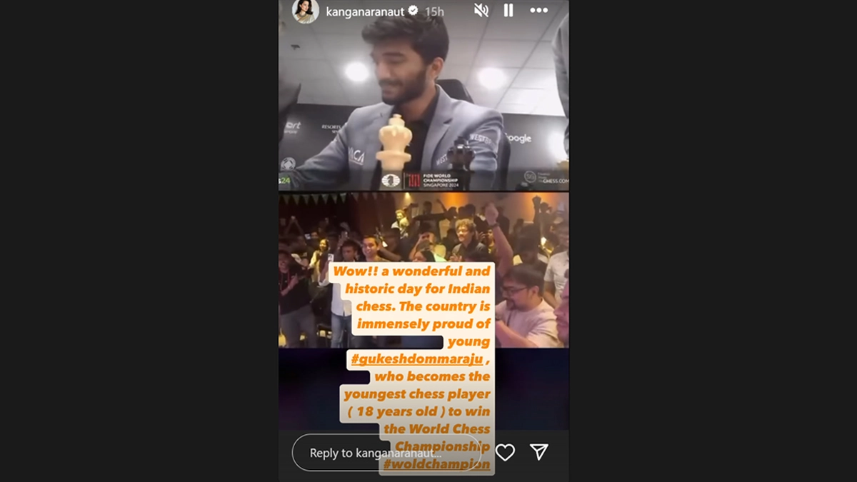 Calling it a historic day for India, Kangana Ranaut wrote: “Wow!! a wonderful and historic day for Indian chess. The country is immensely proud of young #gukeshdommaraju, who becomes the youngest chess player (18 years old) to win the World Chess Championship #woldchampion.”