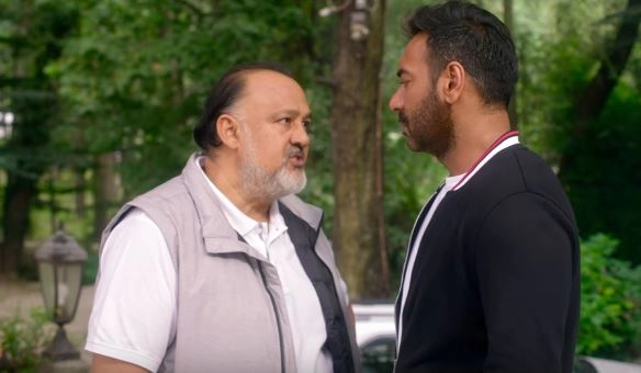 How many time will you make Ajay Devgn repeat his Singham act before film-makers themselves find it trite? In De De Pyaar De, Ajay Devgn once again gets into Singham mode when he tackles robbers trying to rob his character and get handy with Aisha (on her insistence; this girl is a certified moron). Nothing wrong with some fan-servicing, but it shouldn't feel random and out of place. Later, the film throws in another throwback gag, this time on Vijaypath, that had Ajay and Tabu. Once again, it feels shoe-horned into the narrative rather than being a natural gag.