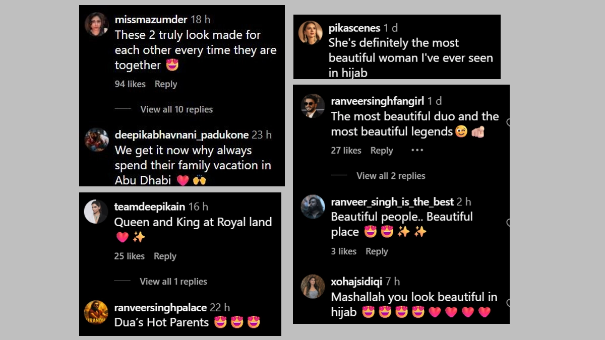 Fans flooded social media with admiration for the couple. Many praised Deepika’s elegant hijab, with one user writing, “She looks amazing with hijab,” and another commenting, “This gorgeous hijab gave a glamorous look to Deepika.” Several highlighted the couple’s respect for Arab culture, while others gushed over their chemistry, writing, “Queen and King at Royal land,” and “These two truly look made for each other every time they are together,” another wrote, "We get it now why always spend their family vacation in Abu Dhabi." Ranveer Singh and Deepika Padukone Reveal Dua’s Face and Introduce Her to Paparazzi; New Parents Request Privacy for Their Daughter (Watch Video)