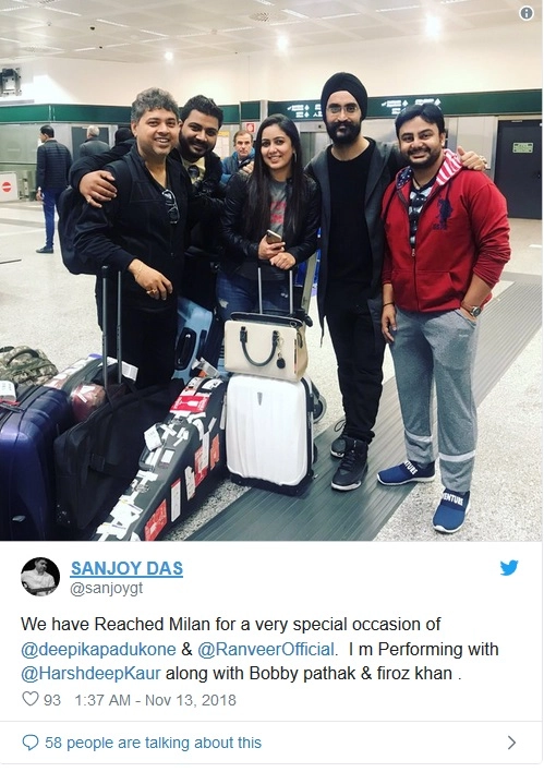Taking to Twitter, musician Sanjoy Das stated how he will be performing at DeepVeer's wedding along with the other artists. His tweet reads, “We have Reached Milan for a very special occasion of @deepikapadukone & @RanveerOfficial. I m Performing with @HarshdeepKaur along with Bobby pathak & firoz khan .” On the same, even Harshdeep Kaur took to her Instagram page to share a special occasion for which she has landed in Milan. Perhaps she will croon to the tunes of Kabira at the sangeet? Anyway check out their posts below.