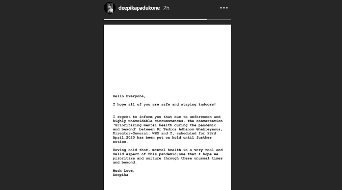 The B-town star was supposed to talk on the issue of mental health amid this testing time of lockdown. However, she put out a statement through her Instagram story that reads, "I regret to inform, you that due to unforeseen and highly unavoidable circumstances, the conversation 'prioritizing mental health during the pandemic and beyond' between Dr Tedros Adhanom Ghebreyesus, Director General, WWHO and I, scheduled for April 23, 2020 has been put on hold until further notice. Having said that mental health is a very real and valid aspect of this pandemic; one that I hope we prioritize and nurture through these unusual time and beyond." Check out her post below.