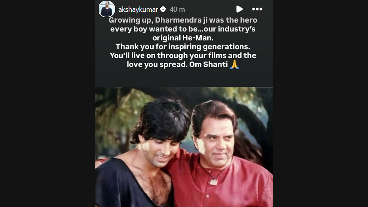 Posting a picture with the late star on Instagram, he wrote: “Growing up, Dharmendra ji was the hero every boy wanted to be...our industry's original He-Man. Thank you for inspiring generations. You'll live on through your films and the love you spread. Om Shanti.” Maidan-E-Jung was directed by K.C. Bokadia. It features an ensemble cast of Dharmendra, Manoj Kumar, Jaya Prada, Akshay Kumar, Karisma Kapoor, Mukesh Khanna, Amrish Puri and Gulshan Grover. This film marks the last on-screen appearance of Manoj Kumar, who retired from acting after its release and died in April 2025. Veteran Bollywood star Dharmendra, aged 89, passed away on Monday morning.