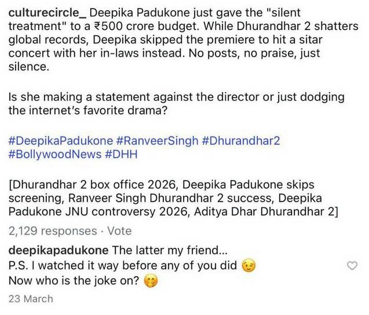The post by the Culture Circle page on Instagram wrote, "Deepika Padukone just gave the "silent treatment" to a ₹500 crore budget. While Dhurandhar 2 shatters global records, Deepika skipped the premiere to hit a sitar concert with her in-laws instead. No posts, no praise, just silence." The page further asked in the caption;: "Is she making a statement against the director or just dodging the internet's favorite drama?"