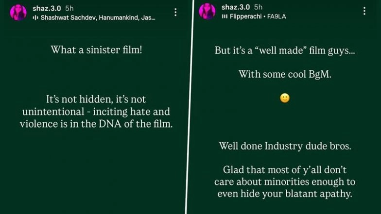 "What a sinister film! It's not hidden, it's not unintentional—inciting hate and violence is in the DNA of the film," Iqbal wrote. She further targeted the technical praise the film has received, adding, "But it's a 'well-made' film, guys… with some cool BGM. Well done, industry dude bros. Glad that most of y'all don't care about minorities enough to even hide your blatant apathy."