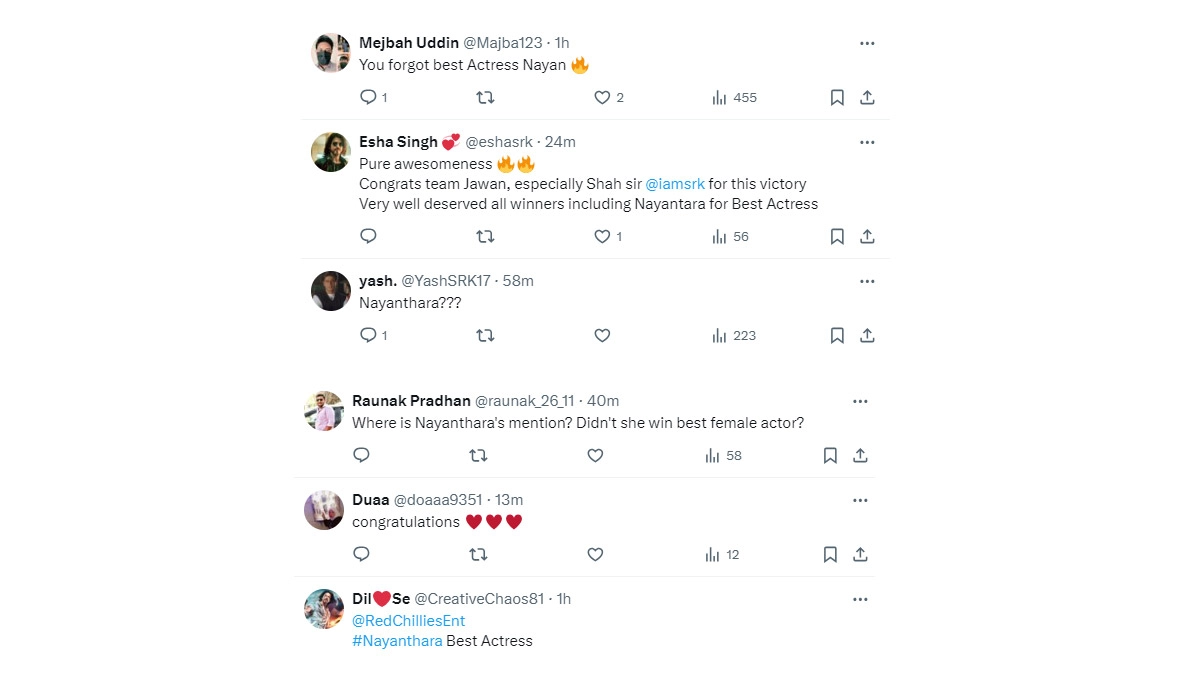 The Dadasaheb Phalke International Film Festival Awards 2024 was held on February 20. The star-studded affair turned out to be a memorable night, with artistes being honoured for their stellar performances. Team Jawan swept awards in some of the best categories, with Shah Rukh Khan winning the Best Actor Award for Jawan, Atlee winning Best Critics Director, Anirudh Ravichander bagging Best Music Director and the action thriller winning in the Best Film category. Red Chillies Entertainment shared a post congratulating the winners. However, the production house’s post on their X handle grabbed eyeballs, with netizens pointing out that Jawan actress Nayanthara had not been included in the post. Dadasaheb Phalke International Film Festival Awards 2024: Shah Rukh Khan's Moving Speech After Winning Best Actor Trophy For Jawan Goes Viral (Watch Video).