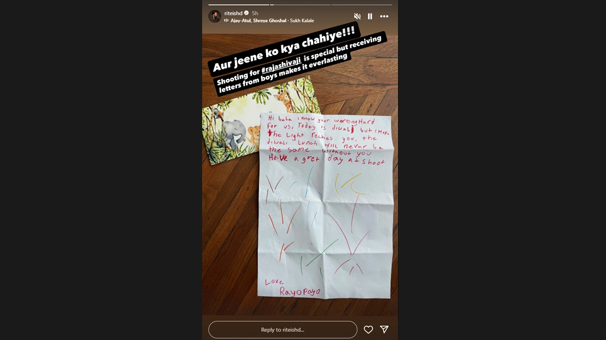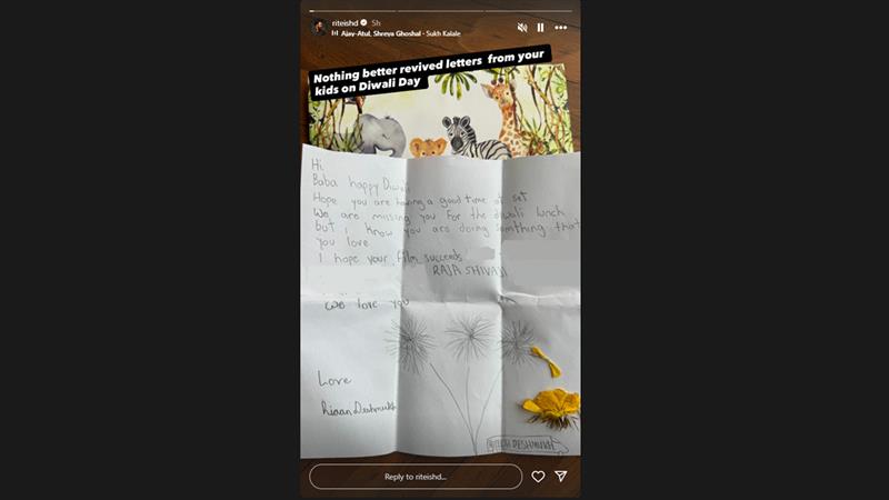 Missing their father during the family Diwali lunch, Riteish's sons- Riaan and Rahyl gifted the actor a handmade Diwali note that went like this, "Hi baba, I know you are working hard for us. Today is Diwali but I hope the light reaches you. The Diwali lunch will never be the same without you. Have a great day at shoot (sic)."