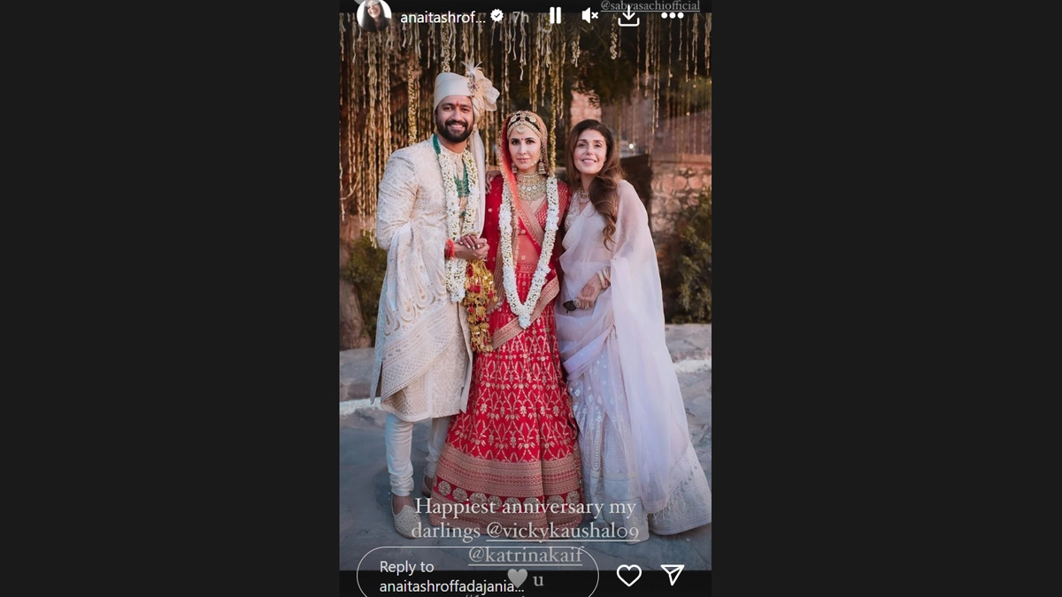 On the second wedding anniversary of Bollywood couple Vicky Kaushal and Katrina Kaif, celebrity stylist Anaita Shroff Adjania dropped a new unseen picture from their big fat wedding. Taking to Instagram, Anaita shared a picture on her stories, captioning it, "Happiest anniversary, my darlings (a white heart emoticon) u. #besttimeever." In the photo, Vicky and Katrina are dressed as bride and groom, posing with Anaita. The couple tied the knot on December 9, 2021, in Rajasthan, hosting grand celebrations at Six Senses Fort Barwara. Vicky shared a cute video of Katrina on the special occasion, showcasing her action moves during an in-flight entertainment session. Vicky Kaushal Showers Love on Katrina Kaif, Calls Wifey As His ‘In-Flight and In-Life Entertainment’ (Watch Video).