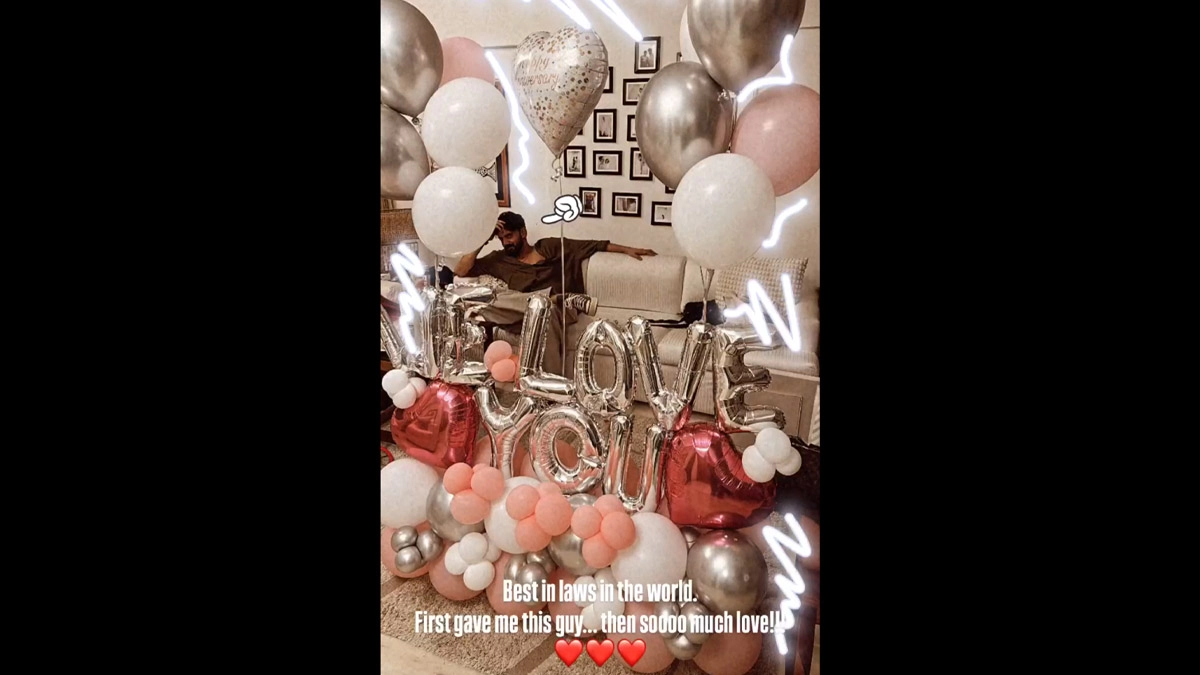 As they complete one year of marital bliss on Monday, actress Sonakshi Sinha, who is married to Zaheer Iqbal, said that her in-laws are best in the world and revealed the reason why. Sonakshi took to her stories section on Instagram, where she shared a picture of her anniversary celebration at home. The picture featured Zaheer sitting in between pink, silver and white balloons which said “We Love You”. Revealing the reason, Sonakshi captioned the post: “Best in laws in the world. First, give me this guy… Then sooo much love.” Sonakshi Sinha Shares Heartwarming ‘Kiss’ Moment From Her 38th Birthday Celebrations With Husband Zaheer Iqbal (Watch Video)