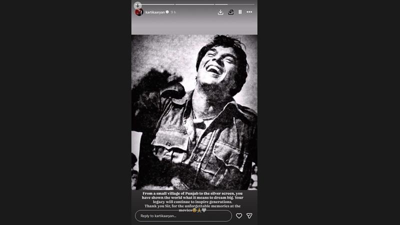 Thanking the legendary star for giving the movie buffs some unforgettable memories, Kartik shared, "From a small village of Punjab to the silver screen, you have shown the world what it means to dream big. Your legacy will continue to inspire generations. Thank you Sir, for the unforgettable memories at the movies, (teary-eyed, folded hands and white heart emojis)."
