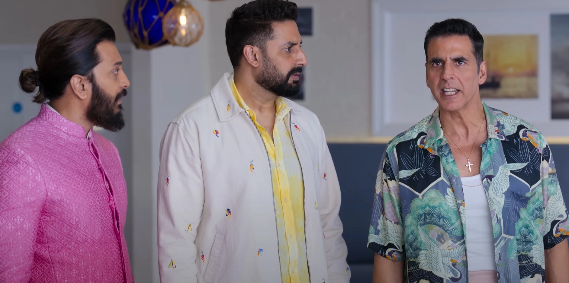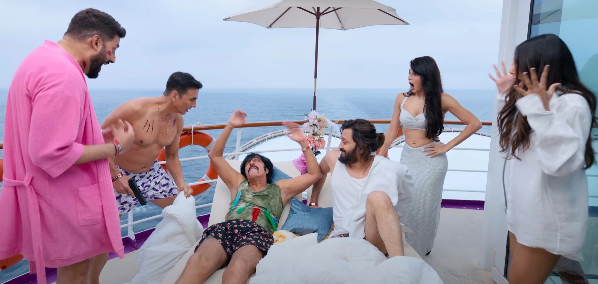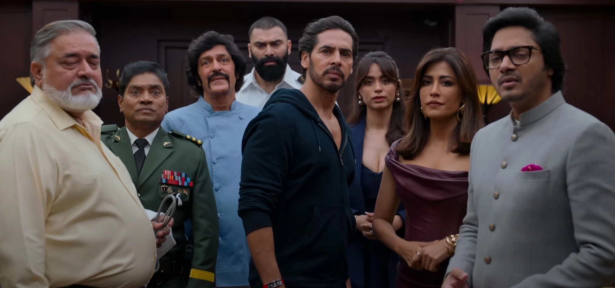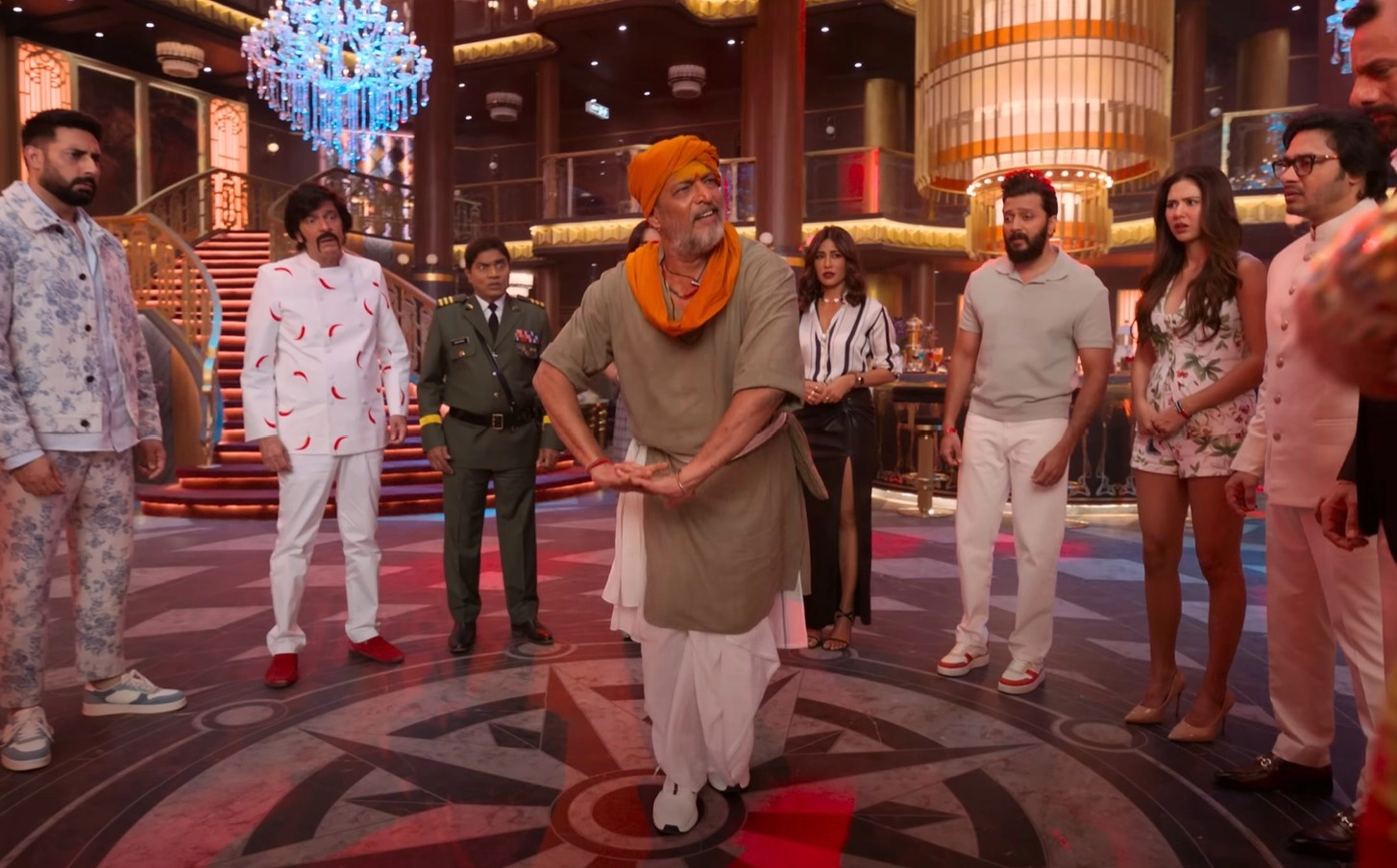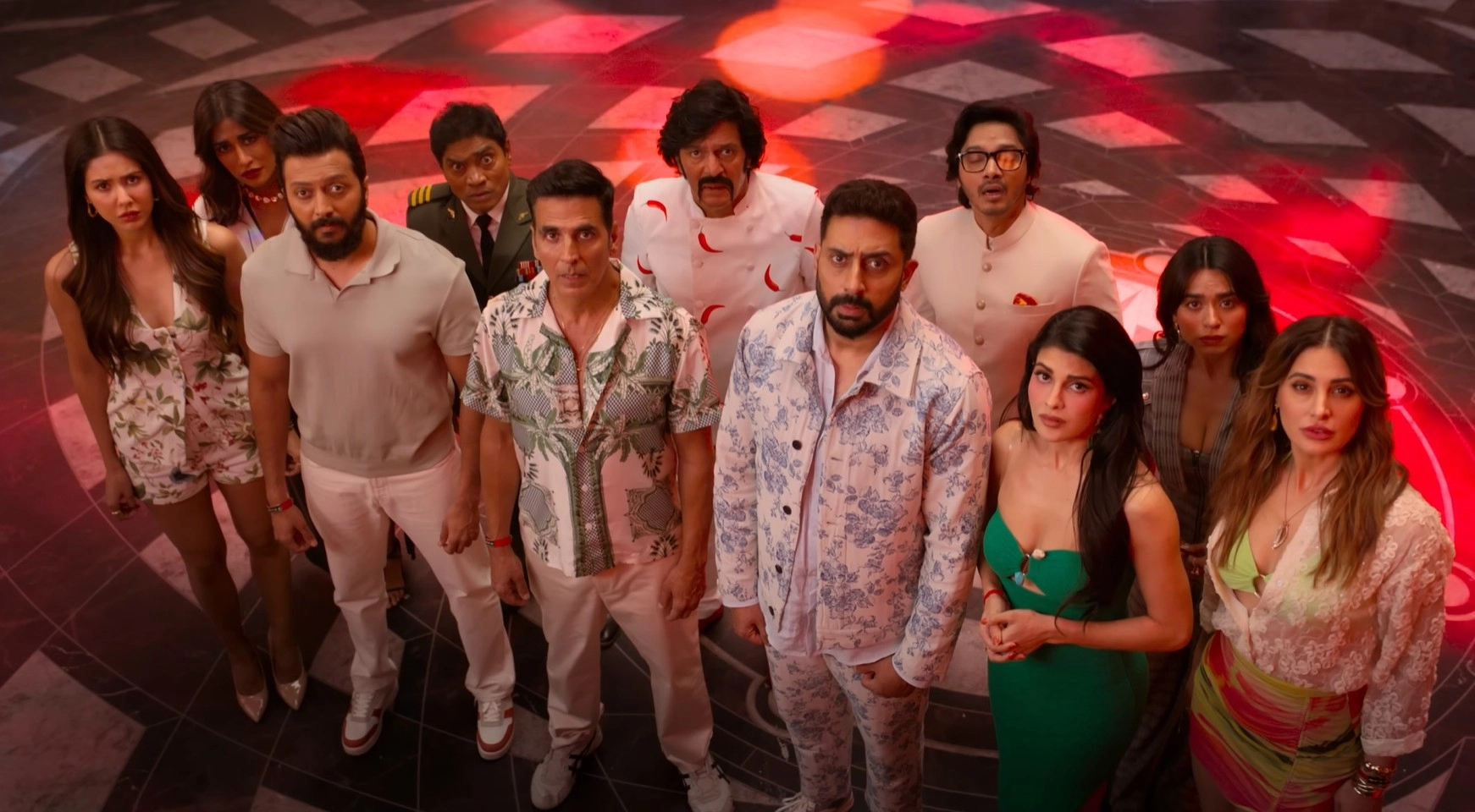 Enter three Jollys: Julius (Akshay Kumar), Jalaluddin (Riteish Deshmukh), and Jalbhushan (Abhishek Bachchan), who claim to be his son and each accompanied by their respective spouses (Nargis Fakhri, Sonam Bajwa, and Jacqueline Fernandez). While the mystery of who the real Jolly is unfolds, the doctor meant to perform DNA tests is murdered (as seen in the prologue). Suspicion falls on the three Jollys, but there are many others aboard who also seem equally shady: Ranjeet’s stepson and board member Dev (Fardeen Khan); three other board members - Shiraz (Shreyas Talpade), Maya (Chitrangda Singh), and Bedi (Dino Morea); Ranjeet’s voluptuous lawyer Lucy (Soundarya Sharma); the cruise chef Aakhri Pasta (Chunky Panday); security chief Batuk Patel (Johnny Lever); and the ship’s captain, Sameer (Nikitin Dheer).
