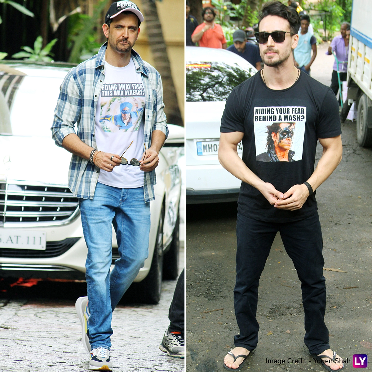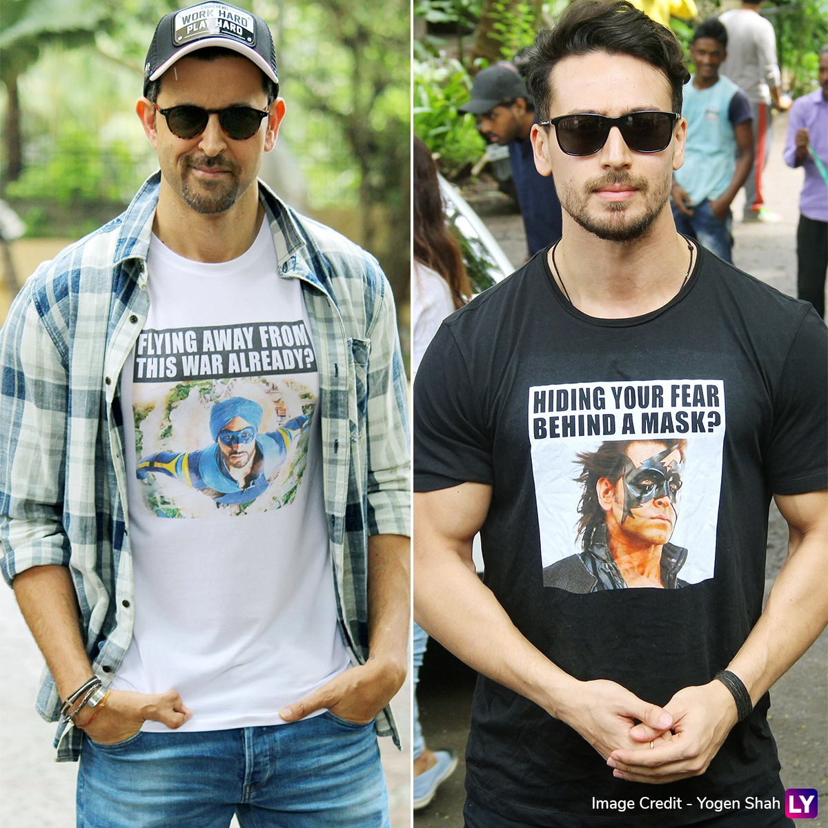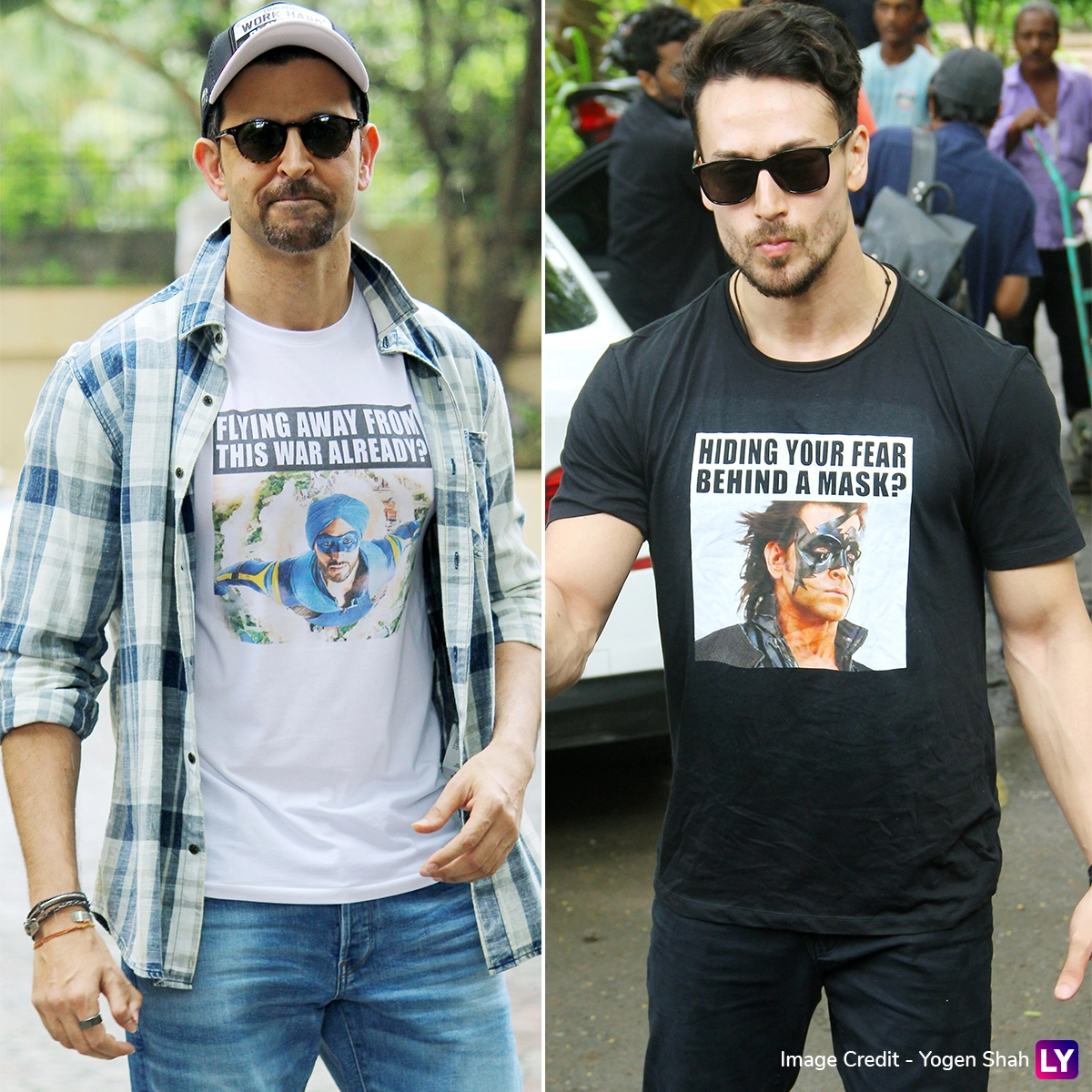Hrithik Roshan and Tiger Shroff are going all out to promote their upcoming action film, War. In the latest, the two actors spotted engaging in (excuse the pun) war with quirky tees as their weapons. In the movie, we will see their characters at loggerheads. Taking the same route for marketing and promotions, Tiger and Hrithik stepped out wearing T-shirts that took a dig at the other person. Firstly, we spotted Tiger wearing a Tee with Krrish's face on it. The caption read, "Hiding your fear behind the mask?" Well, apart from Hrithik's reply to this jibe, this tee also left us waiting, even more, for an update on Krrish 4. Tiger Shroff, Hrithik Roshan’s War Is on Par with ‘Mission Impossible’ and ‘Fast and Furious’ Films, Says Hollywood Action Director (Read Deets).