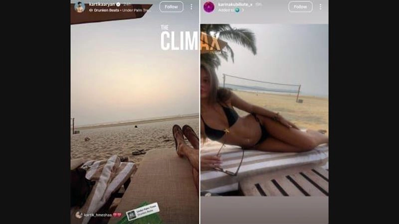 Screenshots of Kartik Aaryan and Karina Kubiliute’s Instagram Stories