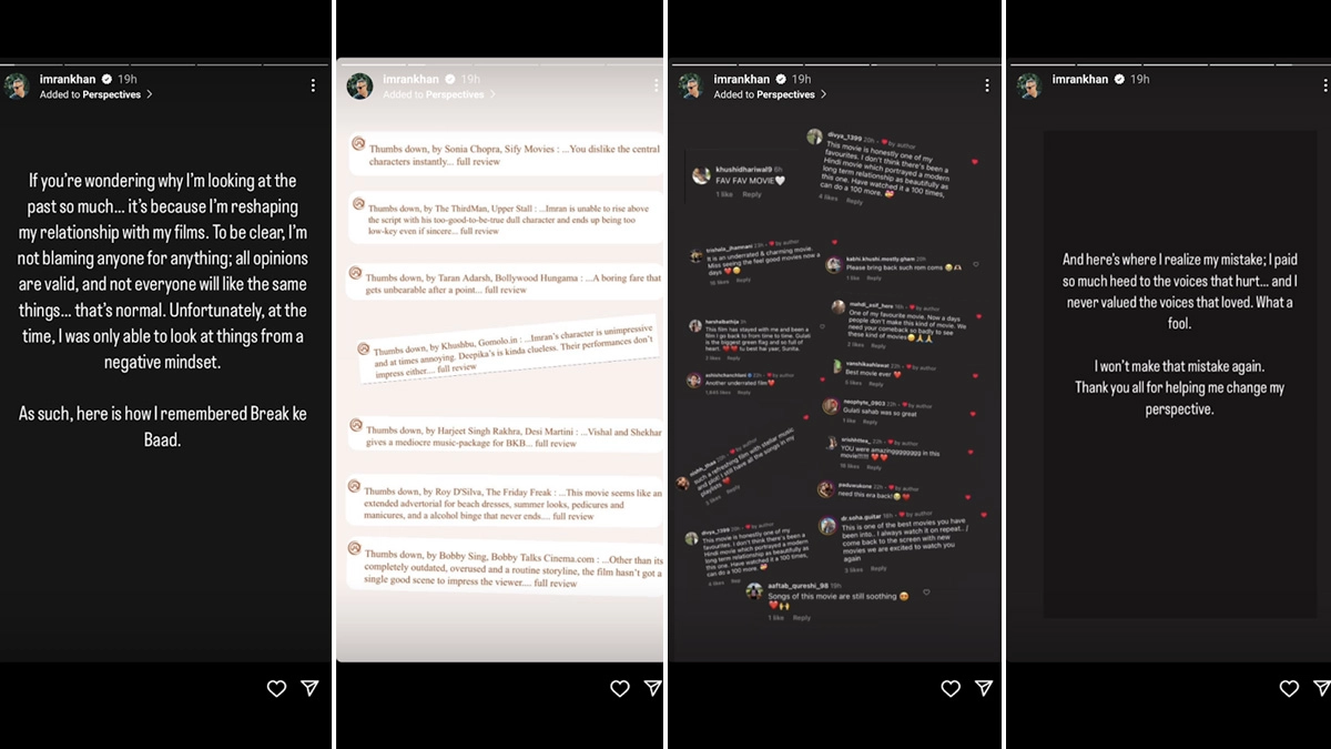 “Unfortunately, at the time, I was only able to look at things from a negative mindset. As such, here is how I remembered Break ke Baad.” Imran then went on to share a few negative reviews for the film, which also stars Deepika Padukone. “That was then," he wrote. Sharing positive reviews, he wrote: “And here's where I realise my mistake: I paid so much heed to the voices that hurt…and I never valued the voices that loved. What a fool. I won't make that mistake again. Thank you all for helping me change my perspective.” Imran had also shared a few glimpses from the romantic comedy, directed by Danish Aslam, which was shot majorly in Mauritius. Imran Khan Spark Dating Rumours With Lekha Washington; Actor Holding Hands With South Star in This Video Goes Viral - WATCH.