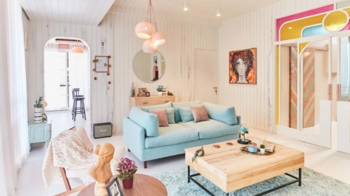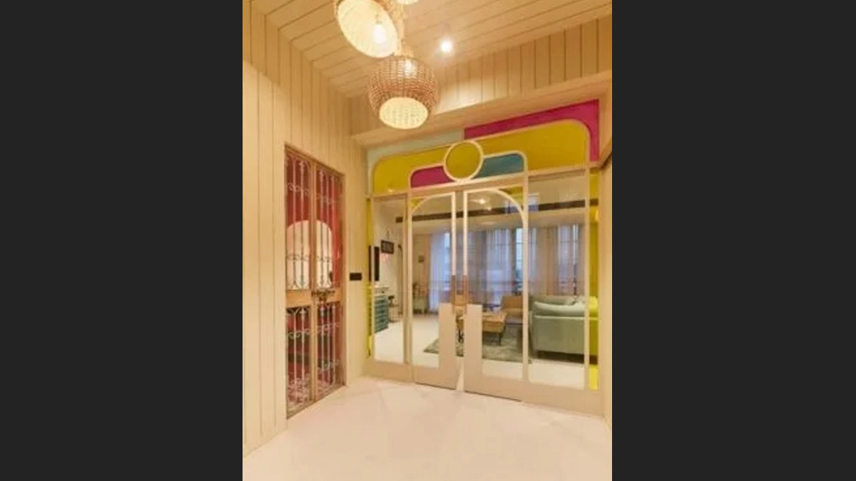 You’re welcomed by a stylish sliding door with yellow glass and pink panels, accented with large brass handles. This door opens into Sonakshi Sinha’s modern living room, where white walls and pastel tones create a serene and inviting space.