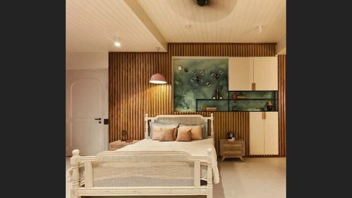 In contrast to the light tones of her living room, Sonakshi Sinha's bedroom embraces a darker palette. Elegant white wall-mounted cupboards seamlessly complement the room’s aesthetic.