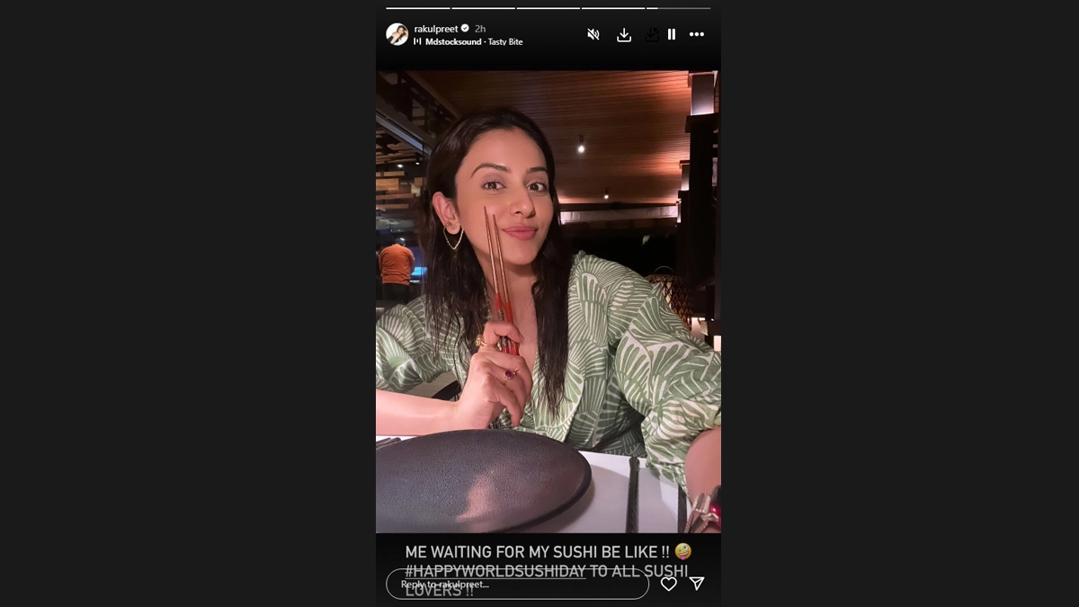 Actress Rakul Preet Singh on Tuesday extended greetings to her fans on International Sushi Day by sharing an unseen picture. Taking to Instagram stories, Rakul, who has 23.7 million followers, posted a picture of herself wearing a green outfit and sitting at a restaurant. In the image, she is holding chopsticks and smiling cutely for the camera. The actress, who was last seen in the Hindi film Chhatriwali, captioned the post: "Me waiting for my sushi be like!! #HappyWorldSushiDay to all sushi lovers!!" International Sushi Day is celebrated to raise awareness about the truth and fiction surrounding sushi. Rakul Preet Singh-Jackky Bhagnani Fiji Vacation Photos and Videos: From Colourful Outfits to Drinking Coconut Water, Couple Enjoy Romantic Getaway.
