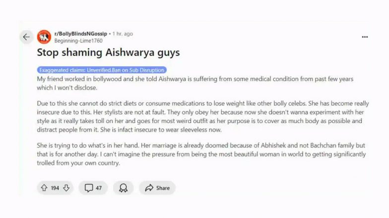 This relentless trolling seemed particularly insensitive, especially for a woman who has long been celebrated as one of the world’s most beautiful individuals. Amid the backlash, a post on Reddit has gained traction, claiming that Aishwarya's recent appearance changes could be linked to an undisclosed medical condition. According to this post, she has been dealing with health issues for several years, which might be preventing her from adhering to strict diets or using weight-loss medications, unlike many of her Bollywood counterparts. Paris Fashion Week 2024: Aishwarya Rai Bachchan Exudes Grace in Red Balloon Hem Dress, Greets Fans With a Namaste on the Ramp (Watch Video).