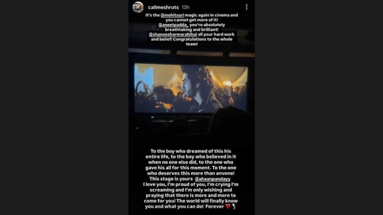 As Ahaan Panday made his grand Bollywood debut with Mohit Suri's Saiyaara opposite Aneet Padda, his rumoured girlfriend, Shruti Chauhan, joined the long list of celebrities, including Mahesh Babu, Alia Bhatt, Ranveer Singh and Karan Johar, who have praised the film. Taking to her Instagram stories, she shared a photo of Ahaan from inside the theatre while watching the film and praised both the film and the actor's performance. She wrote, "It's the @mohitsuri magic again in cinemas and you cannot get more of it! @aneetpadda, you're absolutely breathtaking and brilliant."