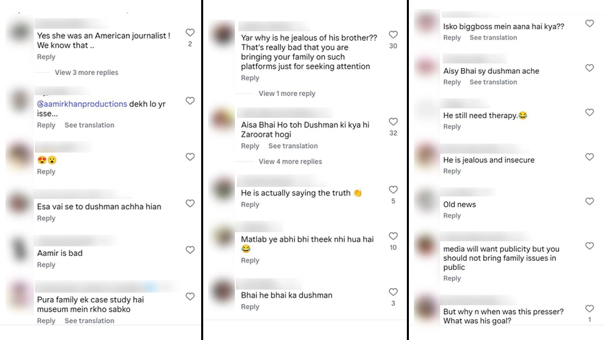 Aamir Khan’s die-hard fans have not taken too kindly to Faisal Khan’s repeated rants against the actor. A fan said on Instagram, “Isko biggboss mein aana hai kya??” (Does he want to enter Bigg Boss?). Another wrote, “Aisa bhai ho toh dushman ki kya hi zaroorat hogi" (With such a brother, who needs an enemy?) “He is jealous and insecure,” commented one user, while another said, “He still need therapy. (sic)” One user suggested, “Faisal should stop it and learn something from Salman khan family, even if there are differences you don’t come on media and say it, Aamir khan is a huge star”, while the other observed, ”How disgusting is this. He literally disrespected his full family on such platforms just to seek some attention from some strangers.” A netizen wrote, “Just sake of publicity he is speaking filth. (sic)” There are also some remarks in favour of Faisal Khan. “Yes she was an American journalist! We know that,” said one man. “So sad, I don’t what happened to this guy but at the moment he’s not fine,” said another. Take a look at the comments.
