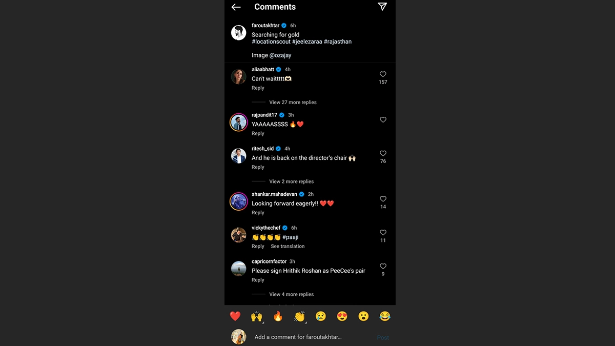 Farhan could be seen dresssed in a jacket, shorts, and boots. He captioned the post: "Searching for gold. #location scout #Jee Le Zaraa #Rajasthan." Reacting to the post, Alia commented: "Can't waittttt." Ritesh Sidhwani wrote: "And he is back on the director's chair."