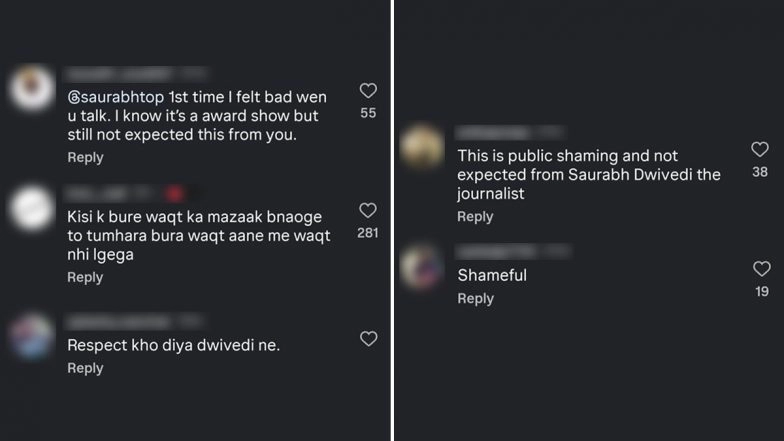 Critics online accused Dwivedi of punching down and humiliating a self-made artiste. A user wrote, "This is public shaming and not at all expected from Saurabh Dwivedi." Another wrote, "Respect kho diya Dwivedi ne." Another comment read, "If you laugh at someone’s tough time, it may cost you later."