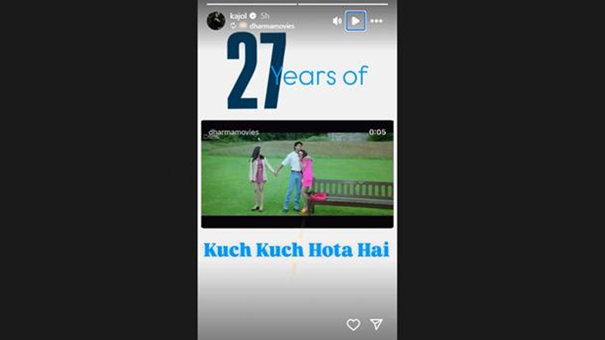 Mumbai, October 16: Actress Kajol, on Thursday, took to social media to celebrate 27 years of her iconic film “Kuch Kuch Hota Hai.” Taking to her Instagram Stories, the ‘Dilwale’ actress reshared Dharma Productions’ video featuring some of the most memorable scenes from the movie. It includes moments with Kajol, Shah Rukh Khan, Rani Mukerji, and Salman Khan, highlighting key interactions, emotional sequences, and fun-filled moments that made the film a beloved classic for audiences over the years.