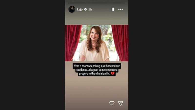 Posting a photo of the late Zarine Katrak, the Kuch Kuch Hota Hain actress, penned on the Stories section of her Instagram account, "What a heart wrenching loss! Shocked and saddened..deepest condolences and prayers to the whole family..(broken heart emoji) (sic)."