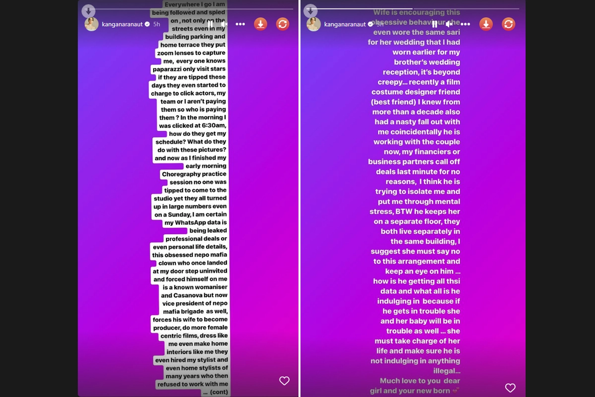 She then referred to nepotism: "This obsessed nepo mafia clown, who once landed at my doorstep uninvited and forced himself on me, is a known womaniser and Casanova but now vice president of nepo mafia brigade as well, forces his wife to become producer, do more female centric films, dress like me even make home interiors like me they even hired my stylist and even home stylists of many years who then refused to work with me." She went on: "Wife is encouraging this obsessive behaviour she even wore the same sari for her wedding that I had worn earlier for my brother's wedding reception, it's beyond creepy...recently a film costume designer friend (best friend) I knew from more than a decade also had a nasty fall out with me coincidentally he is working with the couple now, my financiers or business partners call off deals last minute for no reasons."