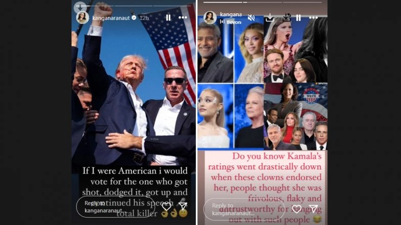In an Instagram post, Kangana blamed several prominent Hollywood celebrities for Harris' drop in approval ratings, accusing them of making her appear "frivolous" and "untrustworthy." She shared a collage of celebrities who had supported Harris, including Taylor Swift, Beyoncé, Jennifer Lopez, Ariana Grande, Billie Eilish, Lady Gaga, Harrison Ford, George Clooney and Arnold Schwarzenegger. "Do you know Kamala's rating went drastically down when these clowns endorsed her? People thought she was flaky for hanging out with such people," Kangana remarked. Her statement about celebrities has stirred a debate about the influence of celebrity endorsements in politics and whether such support can sway public opinion. Kangana called Hollywood celebs 'Clowns' and even shared a photo taken shortly after Trump was attacked during one of his rallies in July 2024, capturing the tense atmosphere surrounding the event. Donald Trump Wins US Presidential Election 2024, Defeats Kamala Harris; Republican Nominee Makes Forceful Comeback.
