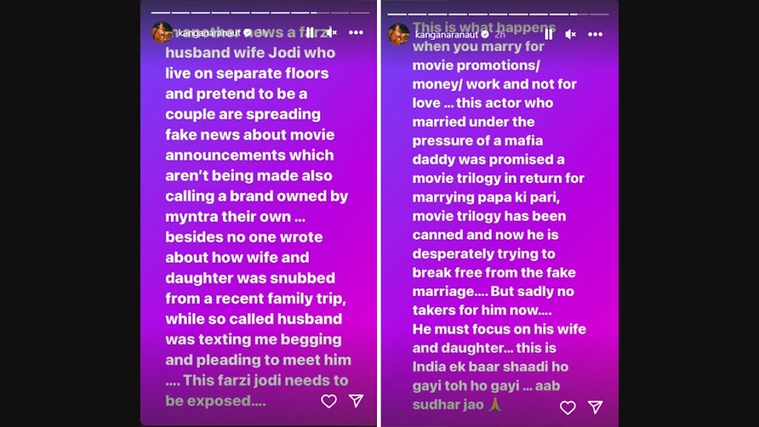 Actress-filmmaker Kangana Ranaut has shared a post on "farzi jodi" making fake movie announcements and claimed that on a recent family trip, the wife and their baby were "snubbed". It seems that Kangana was cryptically taking a dig at Ranbir Kapoor, who was seen in London with his mother Neetu Kapoor and family, and Alia Bhatt, who stayed back with daughter Raha. Adding to that, she mentioned that the "husband" texted Kangana "begging and pleading" her to meet him. Kangana Ranaut on Same-Sex Marriage: It Is a Matter of Heart and Sexual Preference.