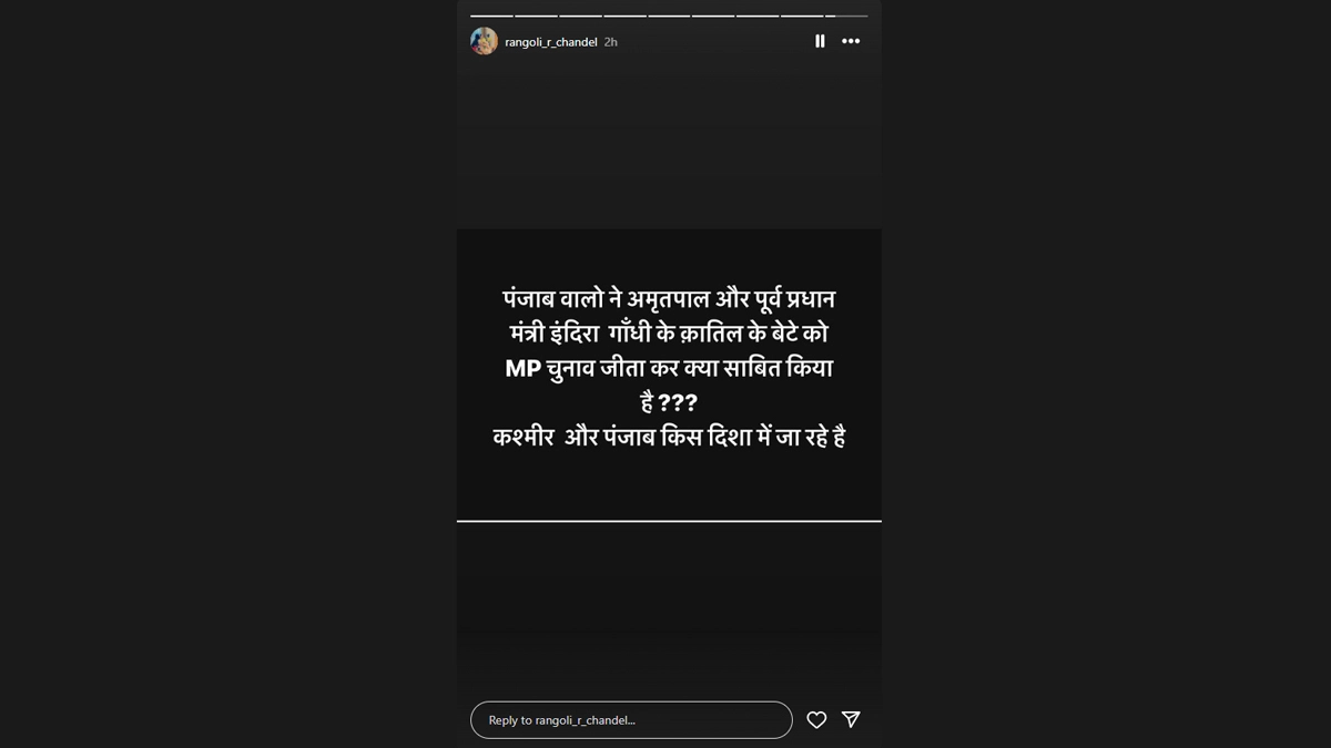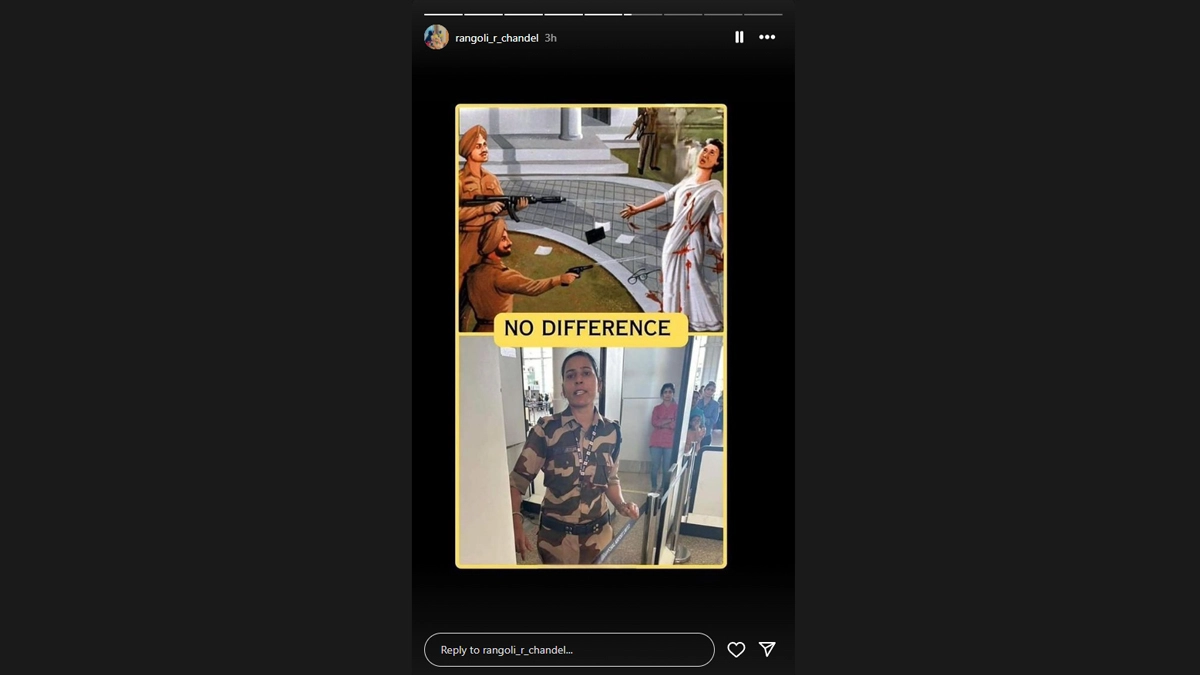 Rangoli Chandel shared a graphic image juxtaposing the representation of ex-PM Indira Gandhi’s assassination with a picture of the CISF constable allegedly involved in slapping Kangana Ranaut. In another post, she wrote, “Suspend karne se isko farak nahi padega...moti rakam aa gayi hogi khalistaniyo se...remand pe lena padega isko... (Suspending her won’t make a difference... (She) must have received a hefty sum from Khalistanis... will have to be taken into custody...”). Check out the posts shared by Rangoli below: