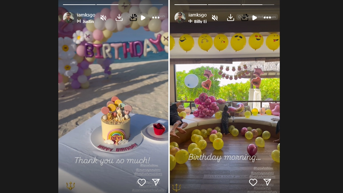 Actor Karan Singh Grover shared a glimpse of his daughter Devi’s second birthday and also her adorable unicorn-themed cake. Karan took to his Instagram stories, where he shared two videos from Devi’s Maldivian birthday party. The first was a video of the set up, which had multi-coloured balloons along with a two-tier unicorn cake. For the caption, Karan thanked everyone. He wrote: “Thank you so much.” Bipasha Basu Pens Emotional Post for Daughter Devi’s 2nd Birthday, Calls Her ‘Pure Joy’ (Watch Video).