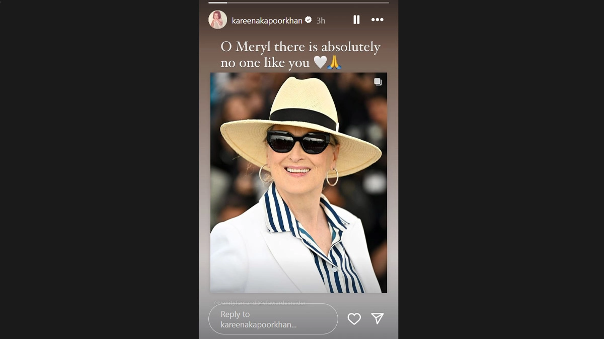 Actress Kareena Kapoor Khan shared a post about Hollywood icon Meryl Streep and said that there is no one like her. Kareena took to her Instagram story, where she shared a post about Streep at the 77th Cannes Film Festival. In the image, the icon is seen wearing a white pantsuit featuring high-waisted trousers and a blue-and-white striped shirt underneath her blazer. “O Meryl there is absolutely no one like you,” Kareena wrote. Kareena Kapoor Khan's Cute Mother’s Day Celebration; Sons Taimur and Jeh Bake Special Cake! (View Pics).