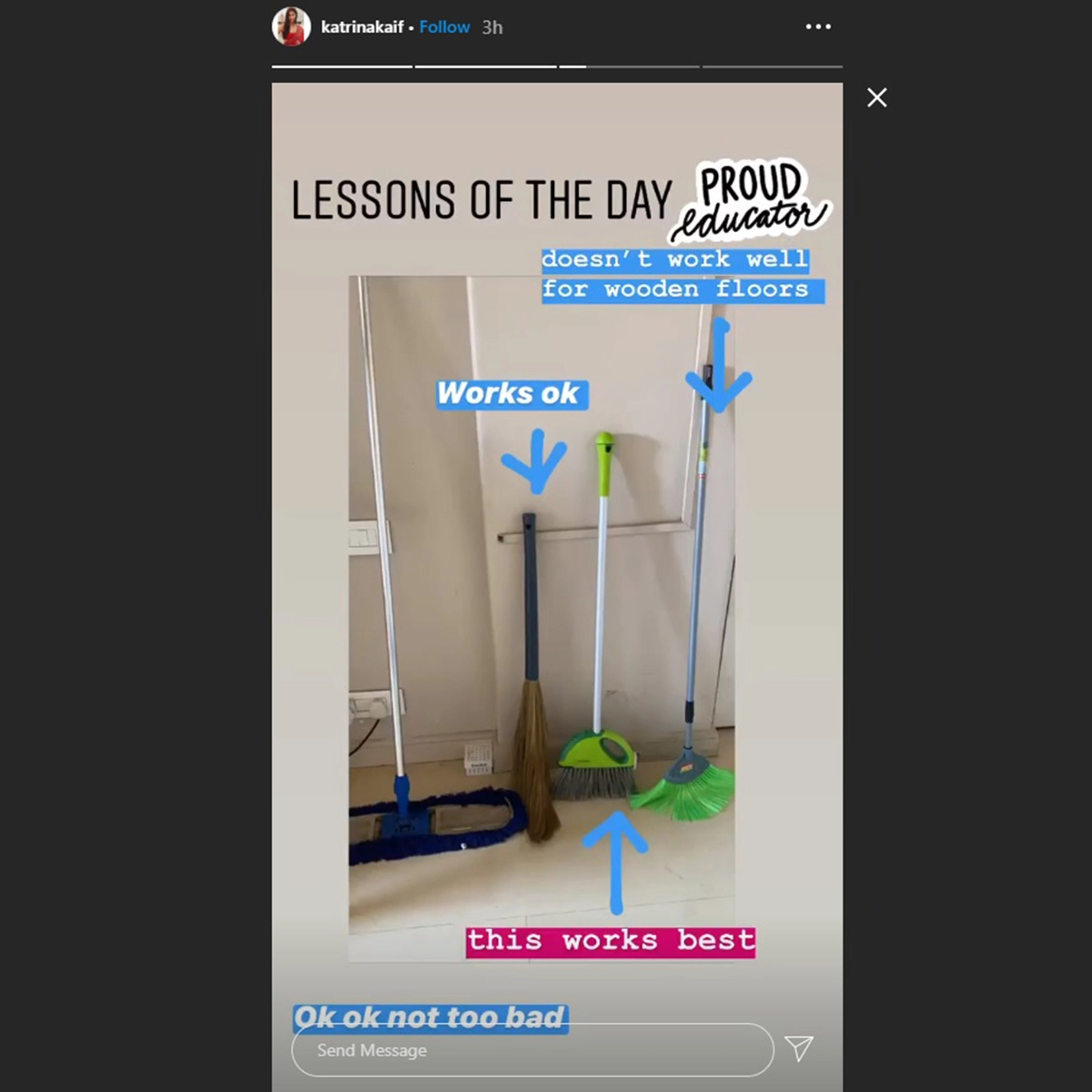 The current lockdown scenes in the country have led to our Bollywood celebs do their household chores on their own. Be it cooking, cleaning utensils to even shopping for the veggies, the stars are doing all the things by themselves minus any house help. Among the pool of B-townies who are performing these tasks, is also actress Katrina Kaif. The Chikni Chameli of Bollywood has till now shown us how to make pancakes and chop vegetables. And now, she's back with another gyaan and it's related to brooms. Yep, Kat took to Instagram stories and shared 'lesson of the day' which she learnt while doing the cleaning her home sweet home. Katrina Kaif's Chef Mode on, Actress Posts Her Video From Kitchen on Instagram.