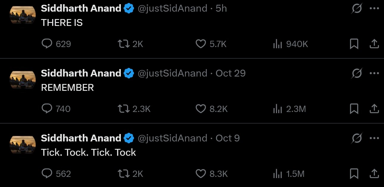Over the past few days, Siddharth has been teasing fans with a series of enigmatic posts such as 'Tick. Tock. Tick. Tock.', 'REMEMBER', and 'THERE IS'. While these may appear to be random musings, fans have noticed a pattern - in both the words and the timing of his posts. Each of them has dropped precisely at 11:30 am IST, leading fans to predict that the next phase of the countdown will culminate on November 2 at 11:30 am, when the big reveal is expected.