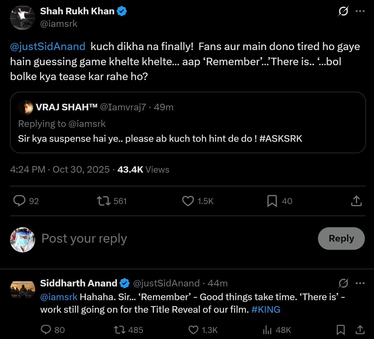 Adding to the buzz, Shah Rukh Khan himself hinted at the possibility during his impromptu #AskSRK session on October 30. When a fan cheekily asked if he could "DM the teaser of King," SRK responded, "Abhi title toh announce kiya nahi officially... tum teaser par kaise pahunch gaye!!!"