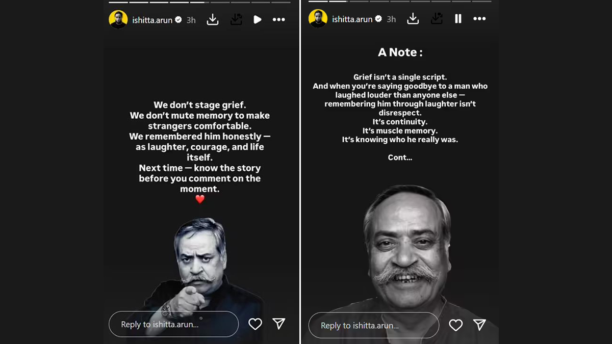 Responding to the backlash, Ishitta took to Instagram Stories on Sunday to clarify the context behind the viral video. She wrote, “What you saw was us laughing at his line - a line only he could deliver. If you had known him, even in passing, you wouldn’t have needed this explained. We don't stage grief. We don't mute memory to make strangers comfortable. We remember him honestly - as laughter, courage, and life itself. Next time - know the story before you comment on the moment.” Piyush Pandey Passes Away: Hansal Mehta, Ehsaan Noorani Pay Tribute to Advertising Maestro.