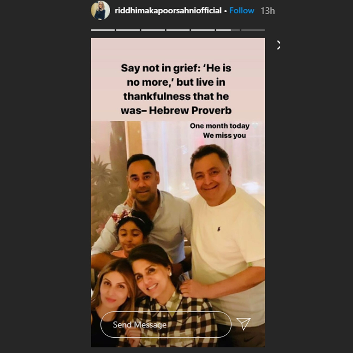Late actor Rishi Kapoor’s wife Neetu Kapoor has shared a beautiful throwback pic in which the couple can be seen twinning in navy blue shirts and jeans. She shared this lovely post by writing, “Wish me luck as you wave me goodbye Cheerio, here I go on my way With a cheer, not a tear, in your eye Give me a smile, I can keep for a while In my heart while I'm away”. Kapoor’s daughter Riddhima Kapoor Sahni also shared a post on her Insta story in which the late actor can be seen along with his wife, daughter, son-in-law Bharat Sahni and grand-daughter Samara Sahni. Late Actor Irrfan Khan’s Wife Sutapa Sikdar Shares Throwback Pics Of Her Husband, Says ‘Milenge Baaten Karenge.... Till We Meet Again’.
