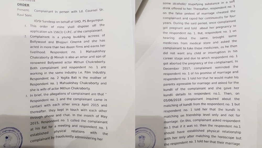 A couple of hours back, news about an FIR filed against Mimoh Chakraborty and Yogita Bali broke. A copy of the same has been leaked. A budding actress claims that Mahaakshay, under the pretext of marrying her, raped her for four years. The FIR also reads that Mahaakshay made her take pills to avoid an unwanted pregnancy. As per the FIR, when the actress found out about Mimoh's marriage with Madalsa Sharma, which is just 5 days away, she contacted him asking for an explanation. It was then that Mimoh's mother, Yogita Bali, called her back and warned her to stay away from her son.