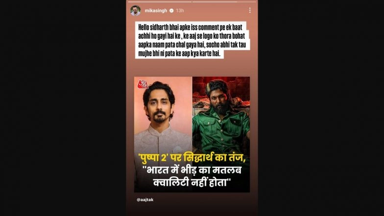 One of the most awaited films of 2024, Pushpa 2: The Rule, starring Allu Arjun, hit the theatres on December 5. The Sukumar directorial co-starring Rashmika Mandanna and Fahadh Faasil is making and breaking records at the box office and has already collected INR 900 crore globally. However, recently Tamil actor Siddharth recently found himself embroiled in a major controversy after he made a remark about the Allu Arjun starrer. The Chithha actor took a jibe at the Telugu film's Patna event and called it a "marketing strategy". He even compared it to people gathering to watch a JCB work. Bollywood singer Mika Singh has now reacted to Siddarth's Comments. ‘Pushpa 2 – The Rule’ Gwalior Show: Canteen Worker Brutally Bites Off Another Man’s Ear During Allu Arjun’s Blockbuster Movie’s Screening in Madhya Pradesh.