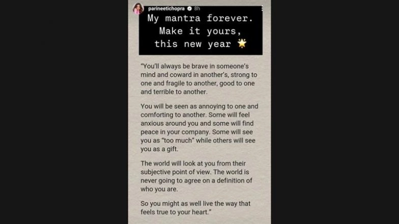 Bollywood actress Parneeti Chopra, who was last seen in the streaming movie Amar Singh Chamkila, has shared her mantra of 2025. On Tuesday, the actress took to the Stories section of her Instagram and shared a note in which she spoke about the dichotomy of existence for the people whose lives a person has touched. New Year 2025: Lovebirds Sonakshi Sinha and Zaheer Iqbal Kick Off Celebrations Early in Australia (Watch Video).