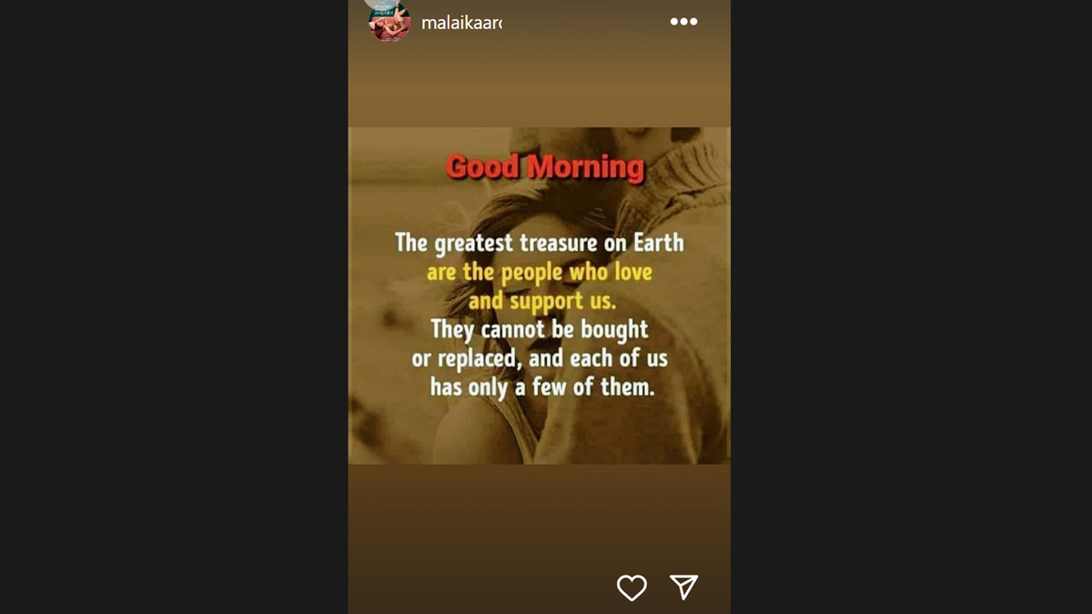 Amid talk of a breakup with actor Arjun Kapoor, actress Malaika Arora shared a cryptic post on Friday, saying "the greatest treasure on Earth are the people who love and support us". Taking to Instagram Stories, Malaika, who has 18.8 million followers, shared a quote that read: "The greatest treasure on Earth are the people who love and support us. They cannot be bought or replaced, and each of us has only a few of them." Arjun Kapoor and Malaika Arora Break-Up, Remain ‘Amicable’ Despite Ending Their Relationship – Reports.
