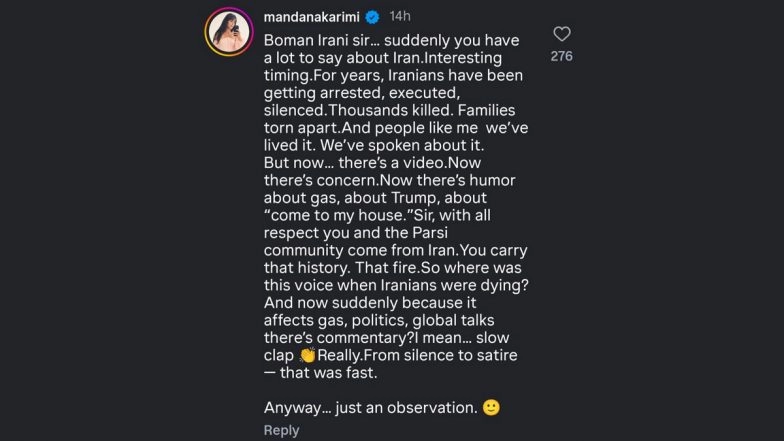 "Boman Irani sir... suddenly you have a lot to say about Iran. Interesting timing," Karimi wrote. "For years, Iranians have been getting arrested, executed, and silenced. Thousands killed. Families torn apart. And people like me—we've lived it. We've spoken about it."