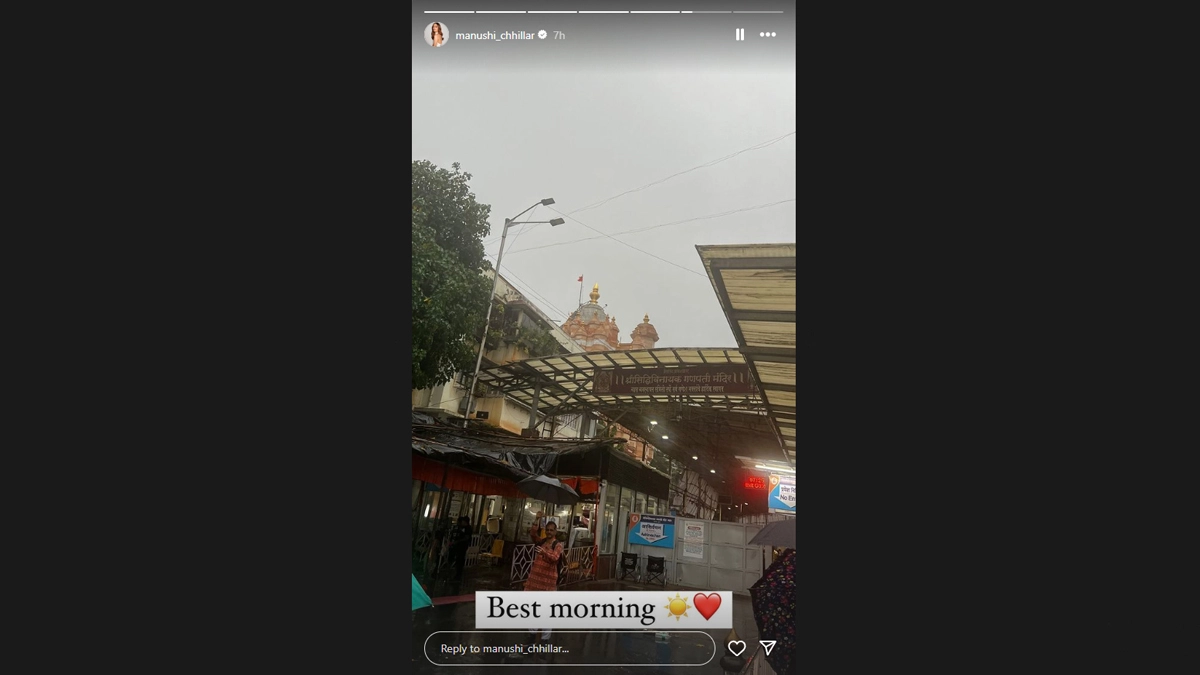 Miss World Manushi Chhillar visited Siddhivinayak Temple on Saturday, amid the heavy downpour in Mumbai, and described it as the ‘best morning’. Taking to Instagram stories, the 27-year-old actress posted a picture of the Siddhivinayak Temple with the caption “Best morning,” followed by a sun and red heart emoji. Is Manushi Chillar Dating Veer Pahariya? Video From Anant Ambani-Radhika Merchant’s Sangeet Ceremony Sparks Rumours.
