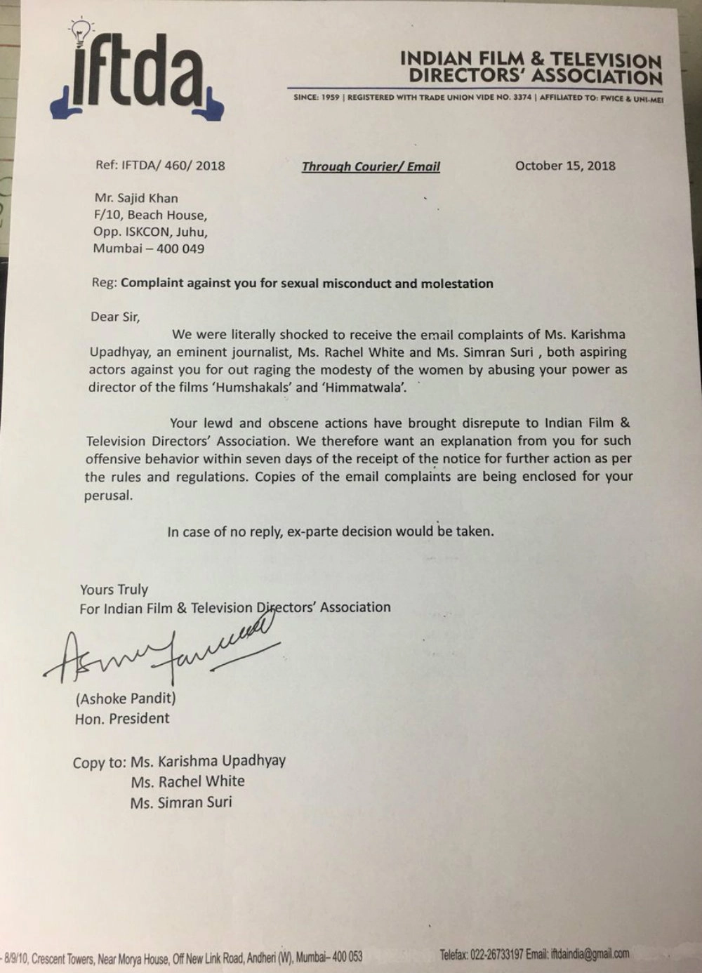 The #MeToo movement has escalated in a short span and the repercussions are seen widely. Bollywood has been hit with it, bringing out unexpected names that got accused of sexual harassment. Director Sajid Khan is one of them, who is facing accusations of sexual misconduct by several women. Saloni Chopra was the first one to open the can of worms after which other women including Rachel White, Mandana Karimi, Karishma Upadhyay, Simran Suri followed. However, in the recent notice issued by Indian Film & Television Directors' Association (IFTDA), Saloni's name is missing.