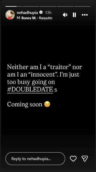 Mumbai, March 25: Actress Neha Dhupia has debunked all rumours about her starring in the reality show “Traitor 2” and cryptically shared that she is busy with a different project titled “Double Date.” Taking to her Instagram stories section, Neha shared a cryptic yet humorous post that read: “Neither am I a ‘traitor’ nor am I an ‘innocent’. I’m just too busy going on #DOUBLEDATE. Coming soon.”