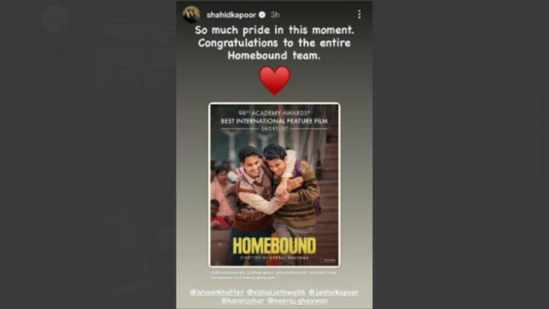 Actor Shahid Kapoor seems to be elated, as his brother Ishaan Khatter’s movie ‘Homebound’ has been officially shortlisted for the upcoming Oscars. Taking to his social media account, Shahid congratulated the entire team of the movie and also mentioned that it is a matter of "pride for him". ‘Homebound’ at Oscars 2026: Vishal Jethwa Reacts As His Film Co-Starring Ishaan Khatter and Janhvi Kapoor Gets Shortlisted for 98th Academy Awards, Says ‘It Is Something I Could Have Only Dreamed Of’.