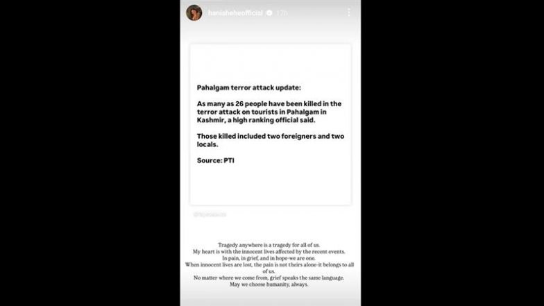 Actress Hania Aamir, who enjoys a huge fan base in India, was one of the first Pakistani celebrities to react to the Pahalgam terror attack. She took to her Instagram story and rehshared a post covering the news and wrote, "Tragedy anywhere is a tragedy for all of us. My heart is wth the innocent lives affected by the recent events. In pain, in grief and in hope - we are one. When innocent lives are lost, the pain is not theirs alone - it belongs to all of us. No matter where we come from, grief speaks the same language. May we choose humanity, always. "