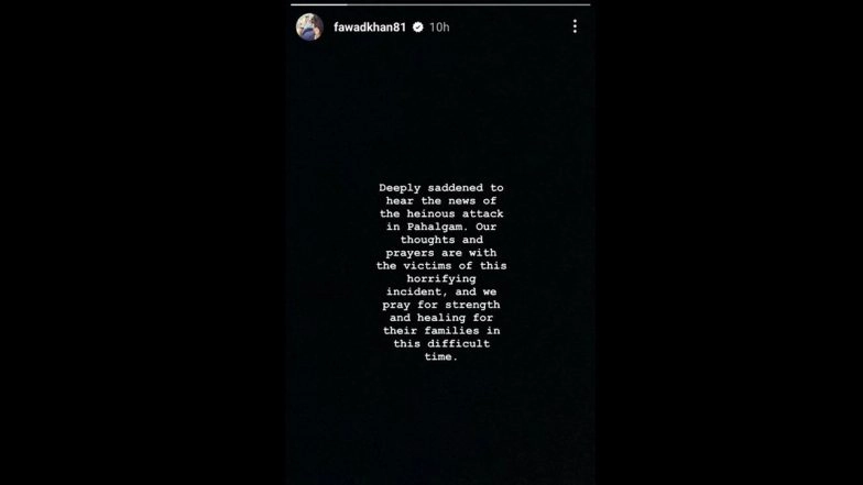 In one of the most shocking terror attacks in the country in recent times, a group of militants opened fire on innocent civilians, primarily tourists, including foreigners, in Jammu and Kashmir's Pahalgam region on Tuesday, April 22. Reportedly, 26 people were killed in the attack. Several Bollywood celebrities strongly condemned the incident on social media. Pakistani actors, who enjoy a significant following in the country, have also expressed their condolences over the horrific incident. Fawad Khan, who is set to make a comeback in the Hindi film industry with Abir Gulaal, also reacted to the attack. Along with him, Hania Aamir and Mawra Hocane have also responded to the tragedy. Amid Pahalgam Terror Attack, Netizens Demand Ban on Pakistani Actor Fawad Khan’s Bollywood Comeback Film ‘Abir Gulaal’, Question ‘Why Are We Giving Them a Chance?’.