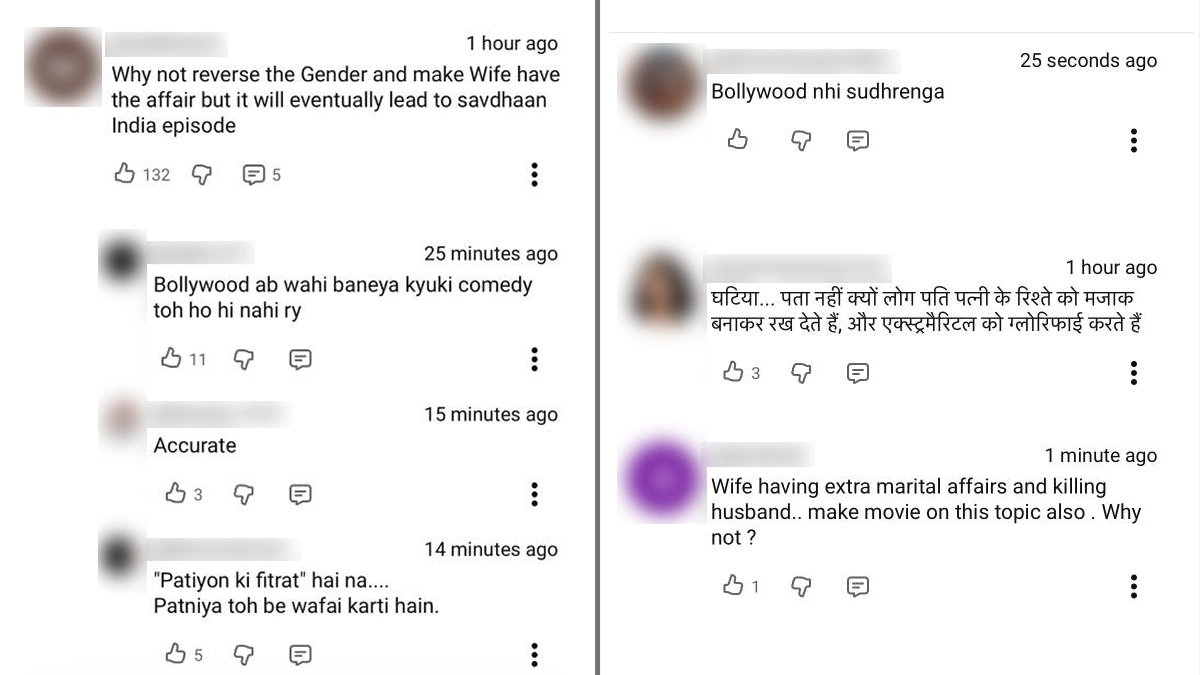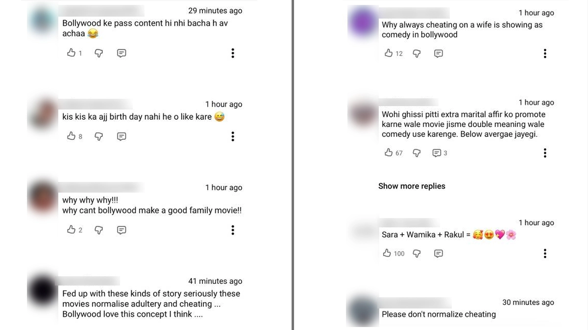 Despite its star-studded appeal, the teaser of Pati Patni Aur Woh 2 sparked strong backlash across social media platforms like X, YouTube and Instagram, with many viewers criticising Bollywood’s continued use of infidelity as a comedic trope. Users questioned the lack of originality, with comments like, “Bollywood ke pass content hi nhi bacha h av achaa,” and “Wohi ghissi pitti extra marital affair ko promote karne wale movie… Below avergae jayegi.” Others raised concerns about morality, stating, “Fed up with these kinds of story seriously these movies normalise adultery and cheating... Bollywood love this concept I think.” Some also pointed out gender bias, asking, “Why always cheating on a wife is showing as comedy in Bollywood? Why not reverse the Gender…,” while many expressed disappointment over the absence of family-friendly content, writing, “Why why why!!! why cant bollywood make a good family movie!!” and “Bollywood nhi sudhrenga.” Summing up the sentiment, several users urged, “Please don't normalise cheating” and “Bollywood Is Really Dengerous for Life,” reflecting widespread criticism surrounding the film’s theme. 'Pati Patni Aur Woh Do' Poster: Sara Ali Khan, Wamiqa Gabbi, Rakul Preet Singh Join Ayushmann Khurrana in Chaotic Comedy.